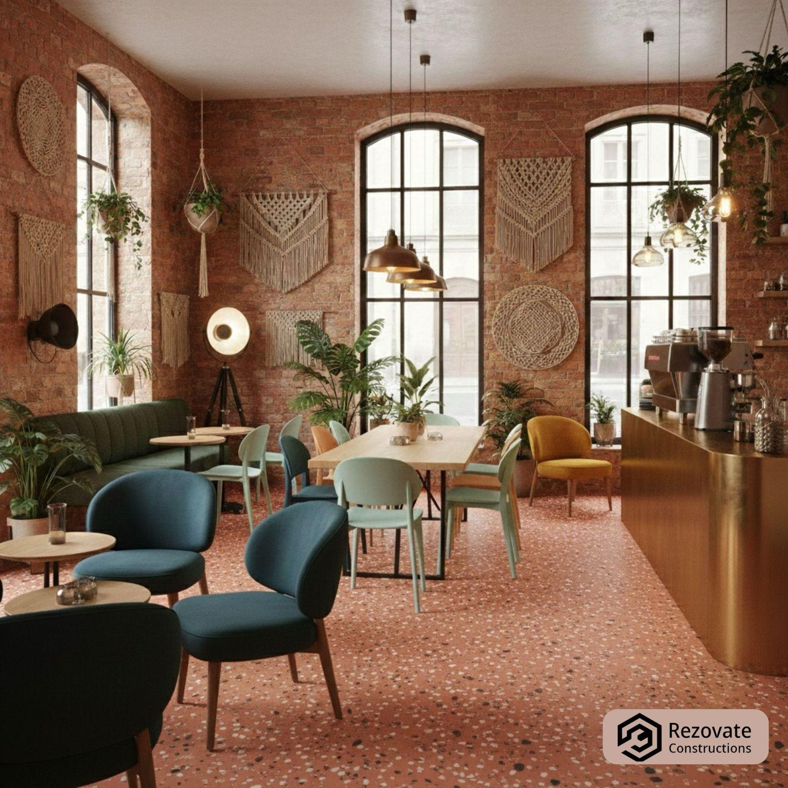 This cafe interior is a masterclass in blending rustic warmth with refined urban design. The centerpiece of the space is the rust terrazzo flooring, which serves as a rich, earthy foundation for the entire room.