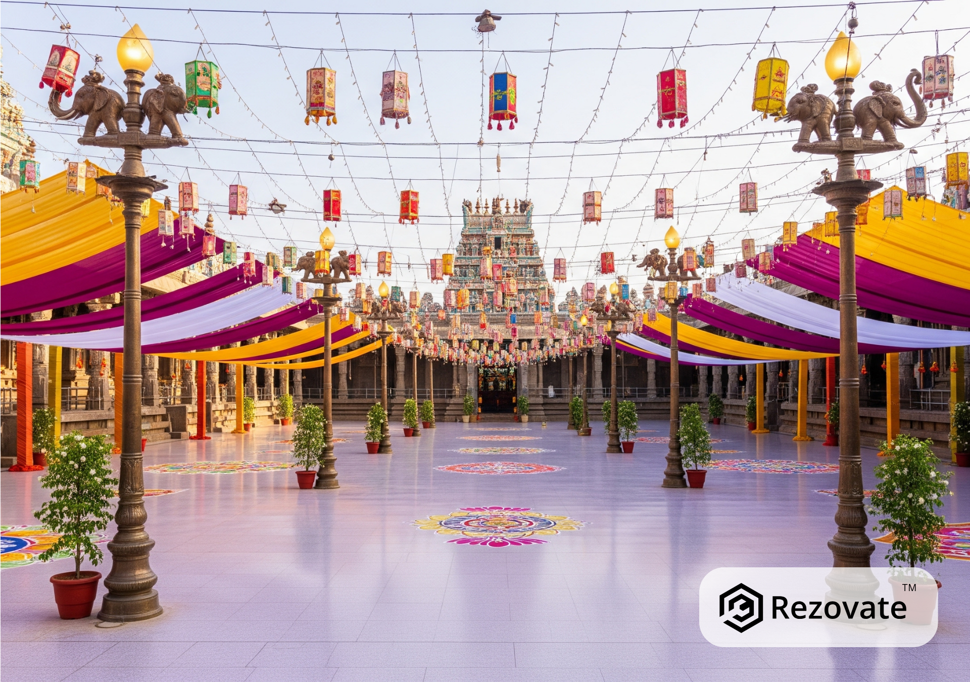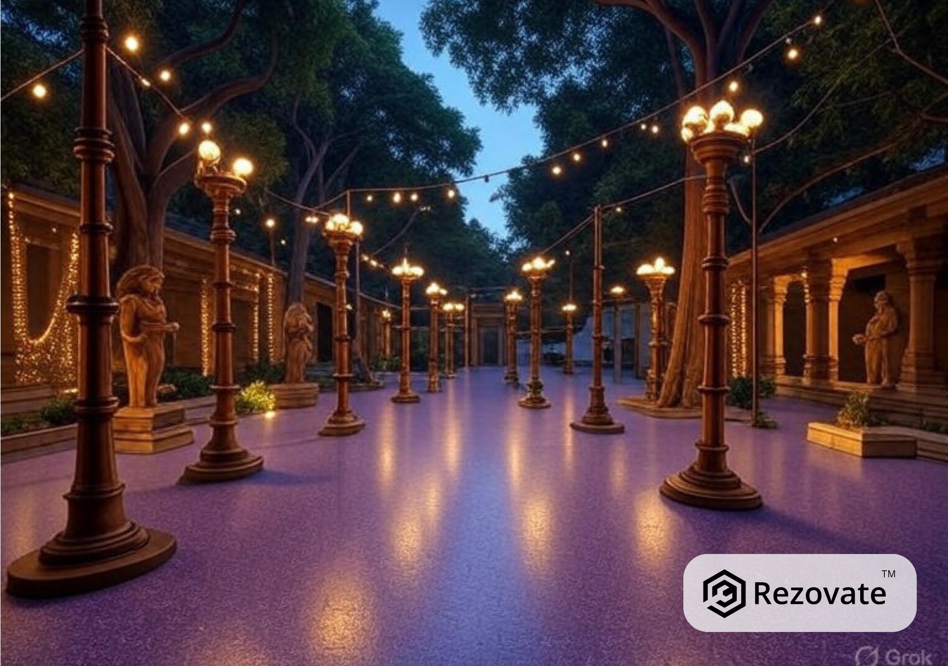 The light lavender terrazzo flooring is the perfect base for the temple courtyard. Its monolithic structure provides a durable, smooth surface ideal for high foot traffic and, crucially, for drawing the intricate, temporary kolams during festivals. The flooring's beautiful color anchors the space, while its glossy surface reflects the colorful fabric canopies and lights. This dynamic effect enhances the vibrant, spiritual atmosphere, transforming the functional space into a radiant focal point for cultural celebration.