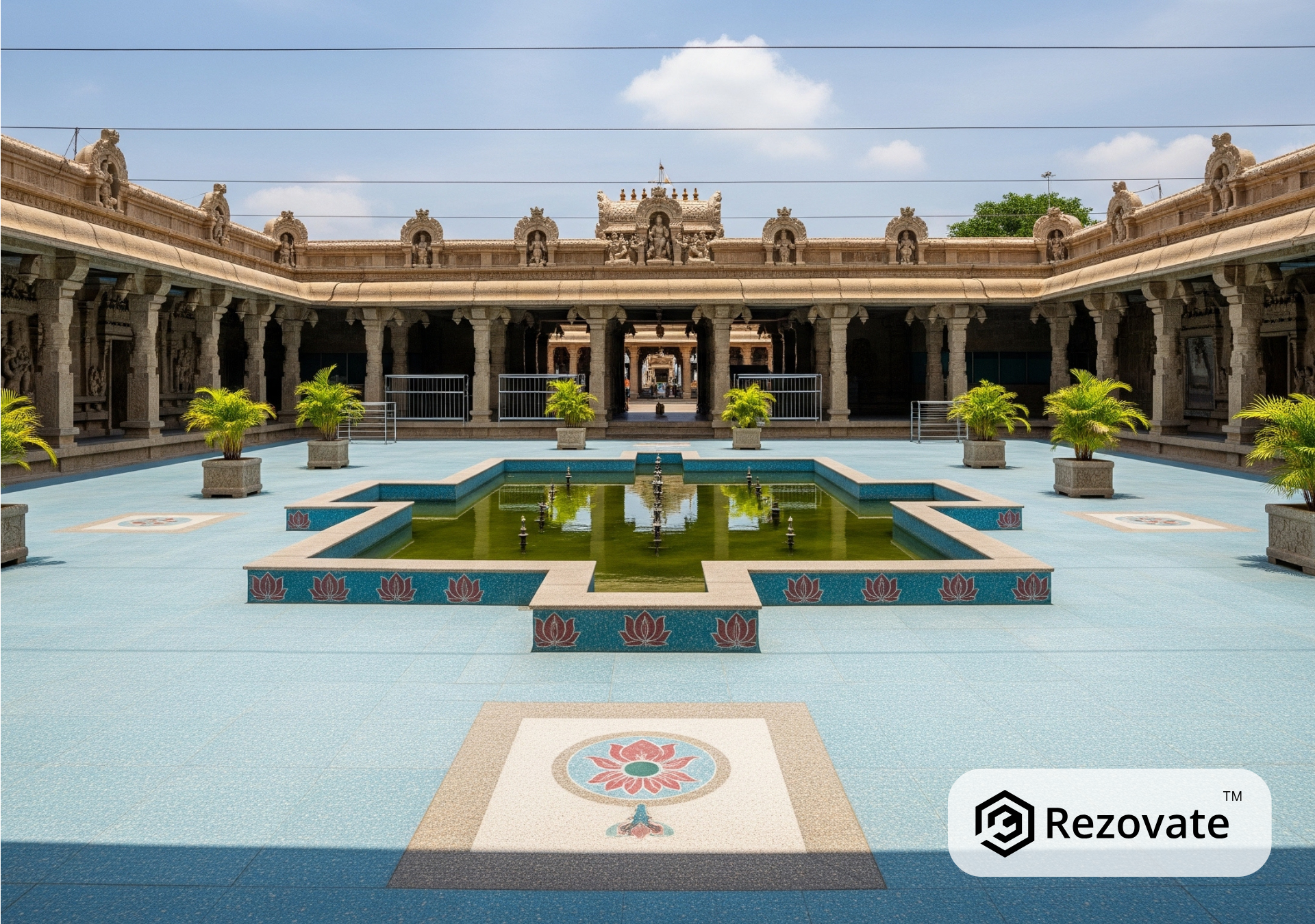 Terrazzo flooring is an ideal choice, offering customizable, elegant designs that blend seamlessly with the temple’s heritage, exceptional durability to withstand heavy use, and a non-porous surface that simplifies cleaning, ensuring hygiene and longevity. Additionally, terrazzo is well-suited to Tiruchirappalli’s hot and humid climate, as it remains cool underfoot, resists moisture-related damage, and maintains its integrity despite temperature fluctuations, making it a practical and resilient option for these sacred spaces.