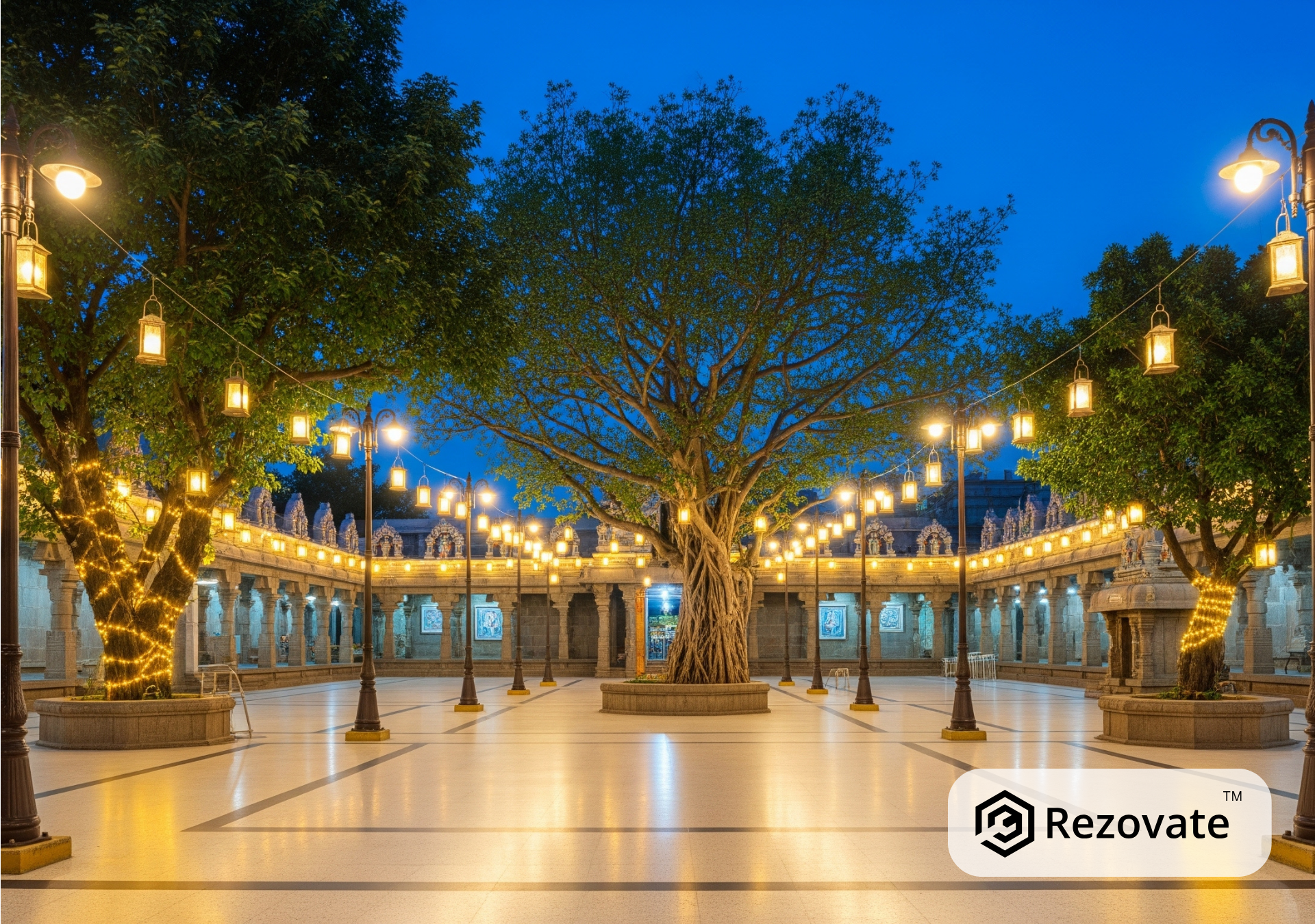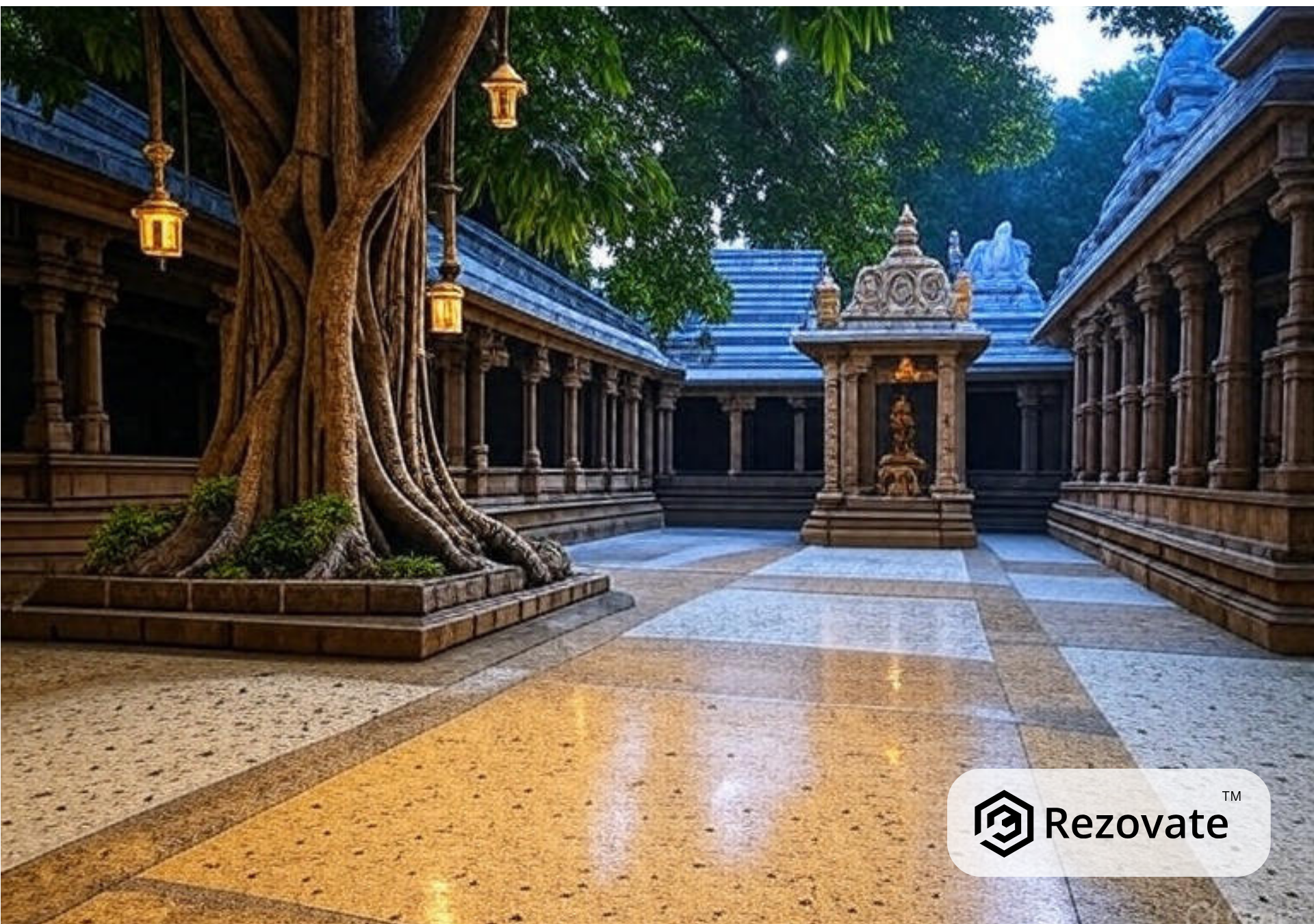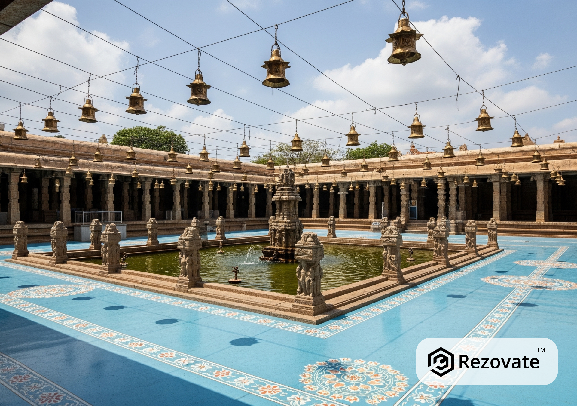 The sweeping terrazzo floor provides a vast, seamless foundation for the courtyard. Its bright, cool blue beautifully offsets the richness of the surrounding stone architecture. Featuring traditional Athanagudi tile work inset as artistic patterns, the floor introduces a vital layer of regional culture. This durable, easy-to-maintain surface successfully blends the temple's ancient structure with a clean, contemporary spaciousness, all while incorporating classic, vibrant design elements.