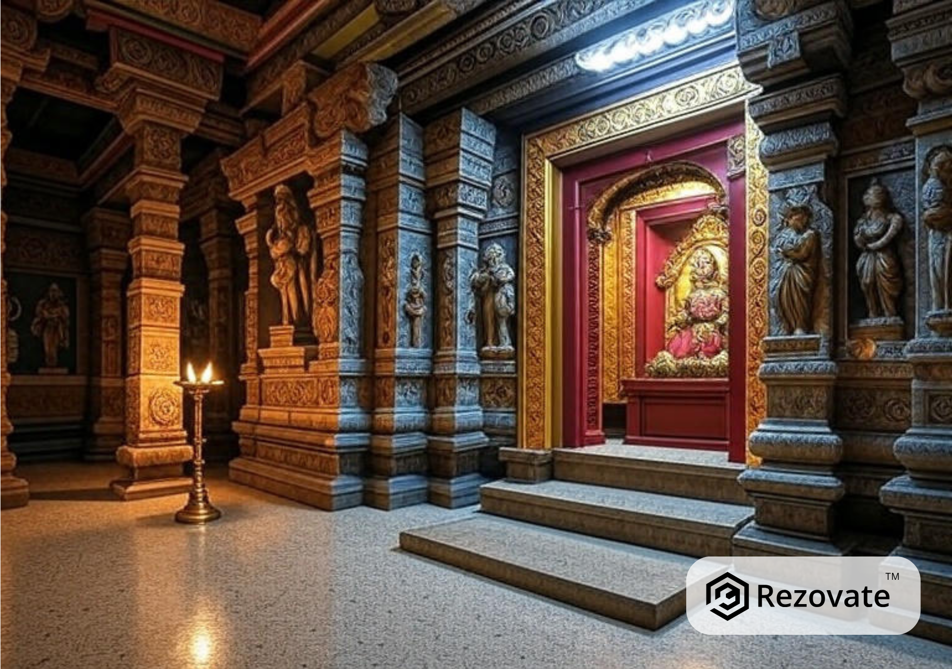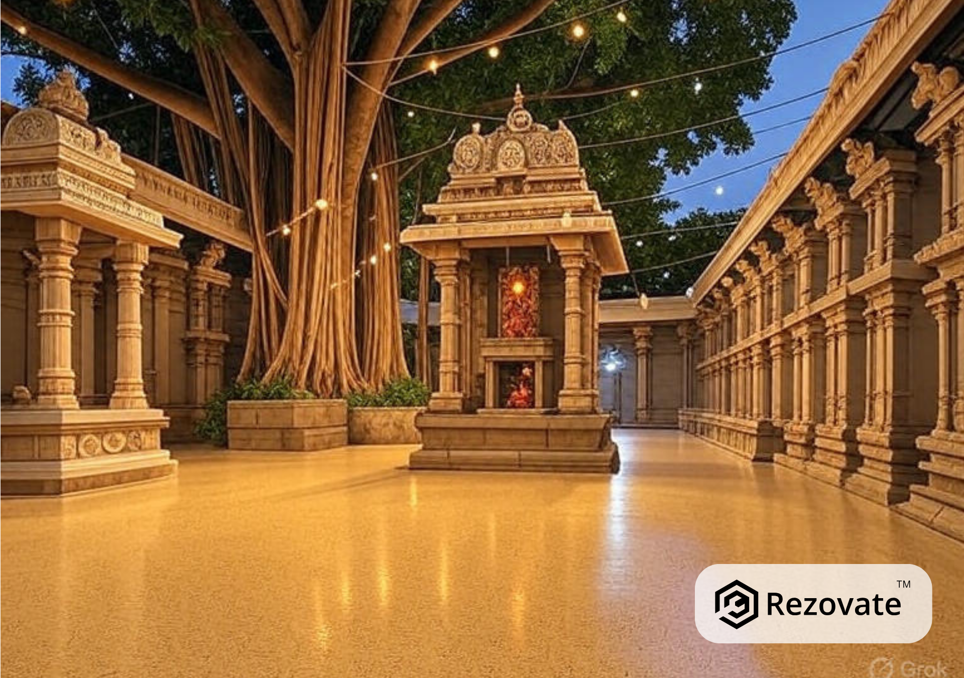 The smooth, reflective terrazzo floor steals the show with its stunning neutral tones and speckled marble and stone chips, perfectly complementing the intricate pillar carvings and golden accents. This flooring’s cool, calming colors enhance the spiritual vibe, reflecting the warm glow of the oil lamp to create an elegant, serene atmosphere that feels tailor-made for divine settings. Durable, easy to maintain, and a seamless fit for heritage architecture.