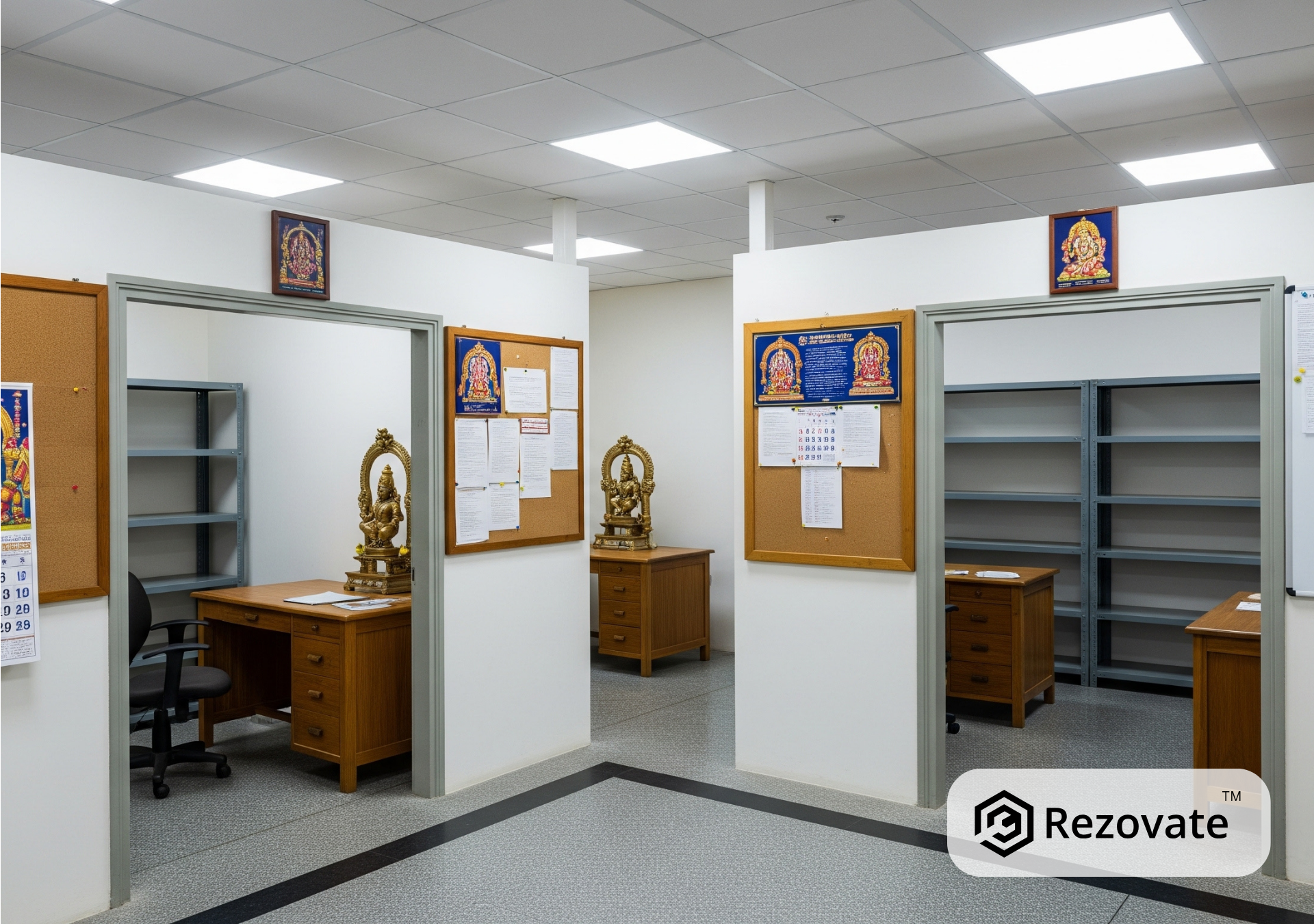 This interior of the office area within the temple complex features light gray or speckled terrazzo flooring, providing a clean, contemporary feel that works well in a functional environment. The monolithic structure ensures a seamless, unbroken surface that contributes to a tidy aesthetic. Most importantly, the durable nature of the terrazzo is ideal for an office setting; it can easily bear the high foot traffic of staff and visitors while maintaining its polished, easy-to-clean surface for many years.